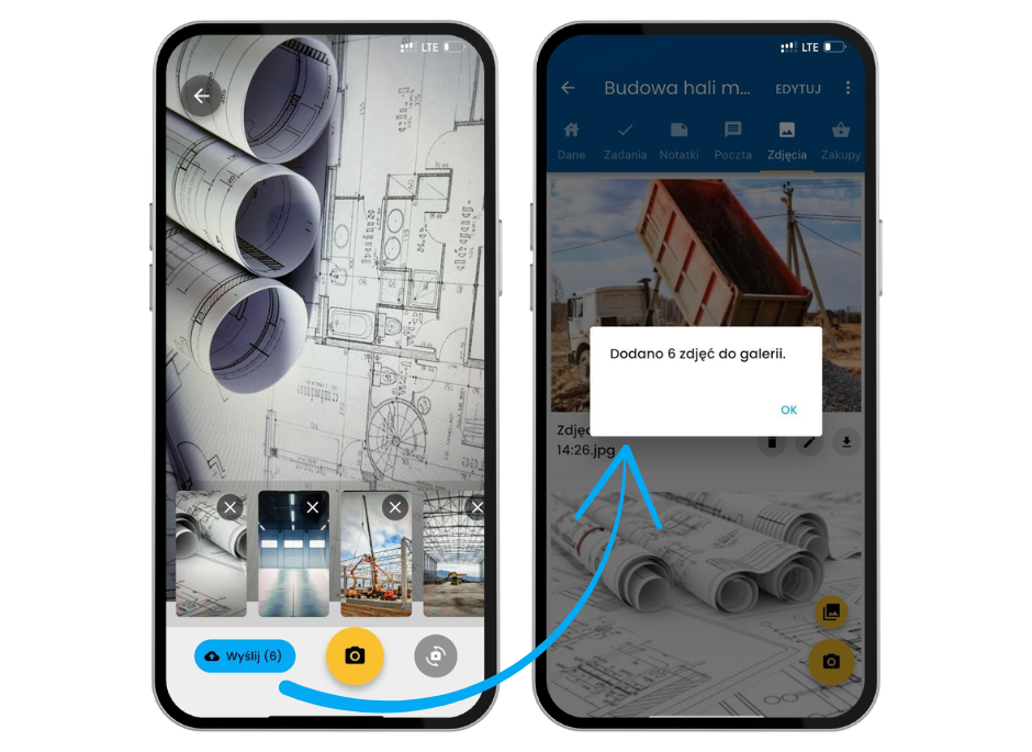 Użytkownik może teraz dodać do zlecenia kilka zdjęć jednocześnie — zarówno bezpośrednio z aparatu, jak i z galerii telefonu. Proces przesyłania jest szybki i intuicyjny, a zdjęcia automatycznie trafiają do galerii projektu.