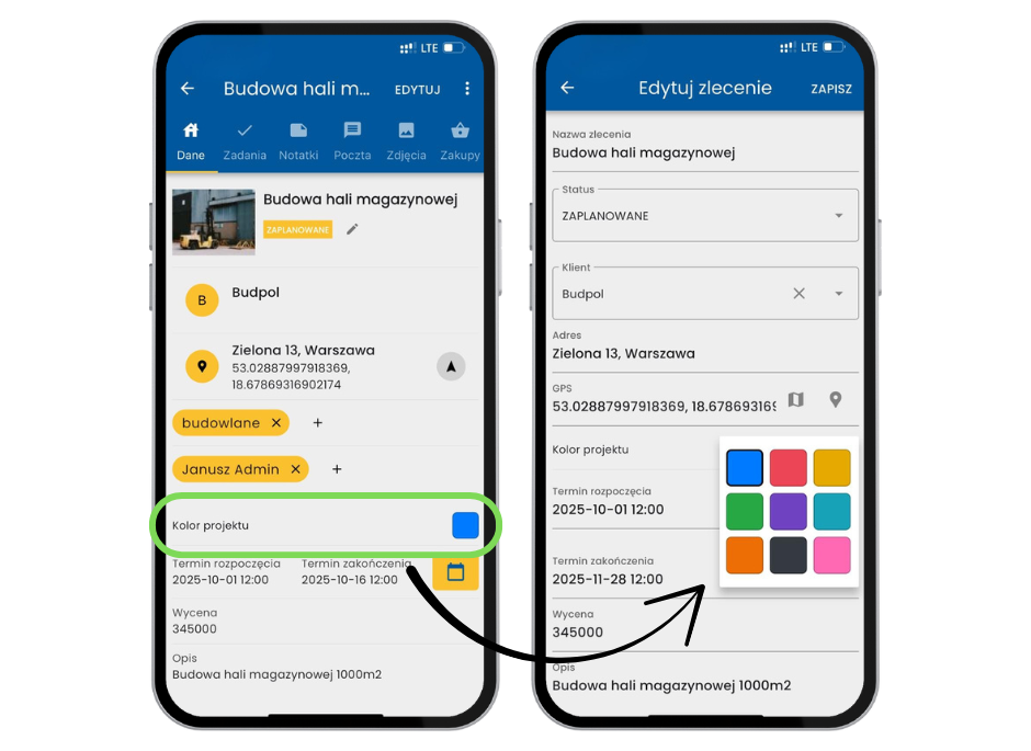 Zlecenia można teraz oznaczać kolorami, co ułatwia ich wizualne rozróżnienie w kalendarzu. Wybór koloru dostępny jest zarówno w aplikacji mobilnej, jak i webowej — z automatyczną synchronizacją między platformami.
